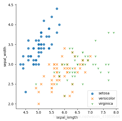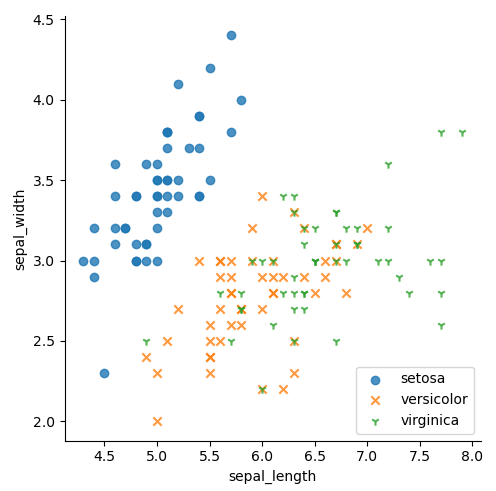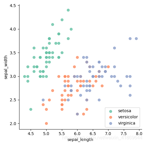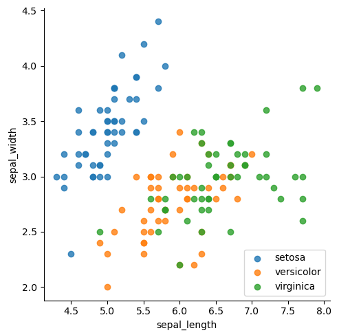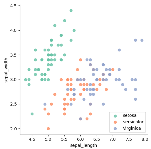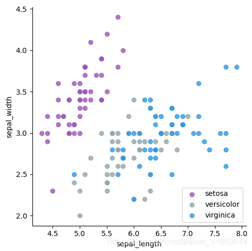 plt.figure(figsize=(480/my_dpi, 480/my_dpi), dpi=my_dpi)sns.lmplot( x="sepal_length", y="sepal_width", data=df, fit_reg=False, hue='species', legend=False, palette=dict(setosa="#9b59b6", virginica="#3498db", versicolor="#95a5a6"))plt.legend(loc='lower right')