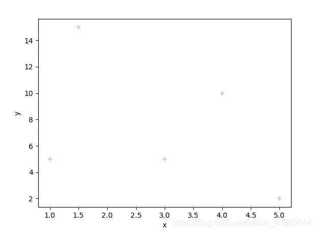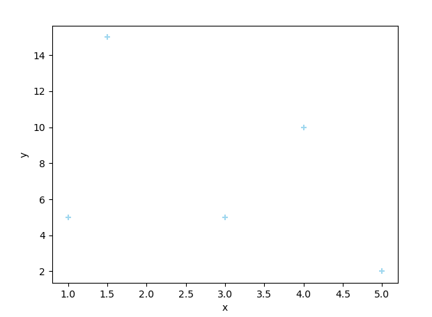 df = pd.DataFrame({'x': [1, 1.5, 3, 4, 5], 'y': [5, 15, 5, 10, 2],'group': ['A','other group','B','C','D']})p1=sns.regplot(data=df, x="x", y="y", fit_reg=False, marker="+", color="skyblue")