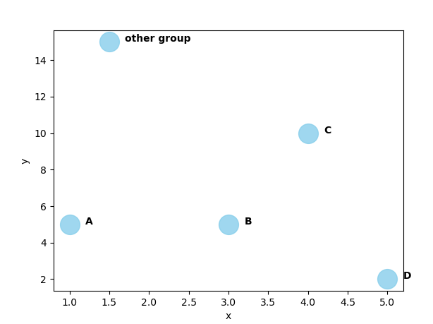 df = pd.DataFrame({'x': [1, 1.5, 3, 4, 5], 'y': [5, 15, 5, 10, 2],'group': ['A','other group','B','C','D']})p1=sns.regplot(data=df, x="x", y="y", fit_reg=False, marker="o", color="skyblue", scatter_kws={'s':400})