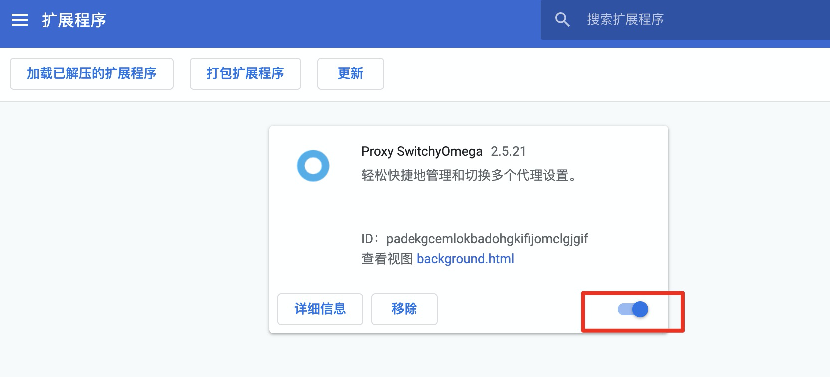(2)将Proxy SwitchyOmeg代理卡片右下角的按钮 点亮