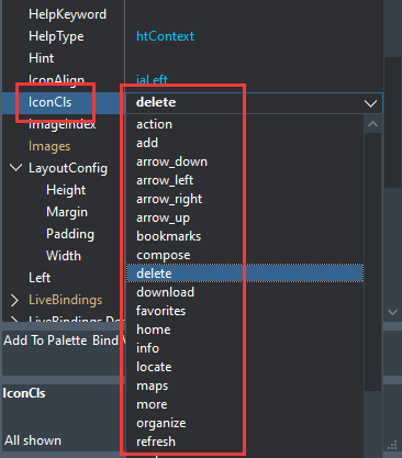 选择ICON对齐方式及系统定义好的ICON对应值。但实际上UniGui中可以使用的图标远远大于他已定义的这十几个(或者应该说是EXJS原本就多,UniGui只定义了很少一部分提供使用)。