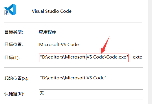我们在上文快捷方式中插入的 --extensions-dir <dir>,最终会被添加到 code 后边的指令集中,然后执行 code.cmd。