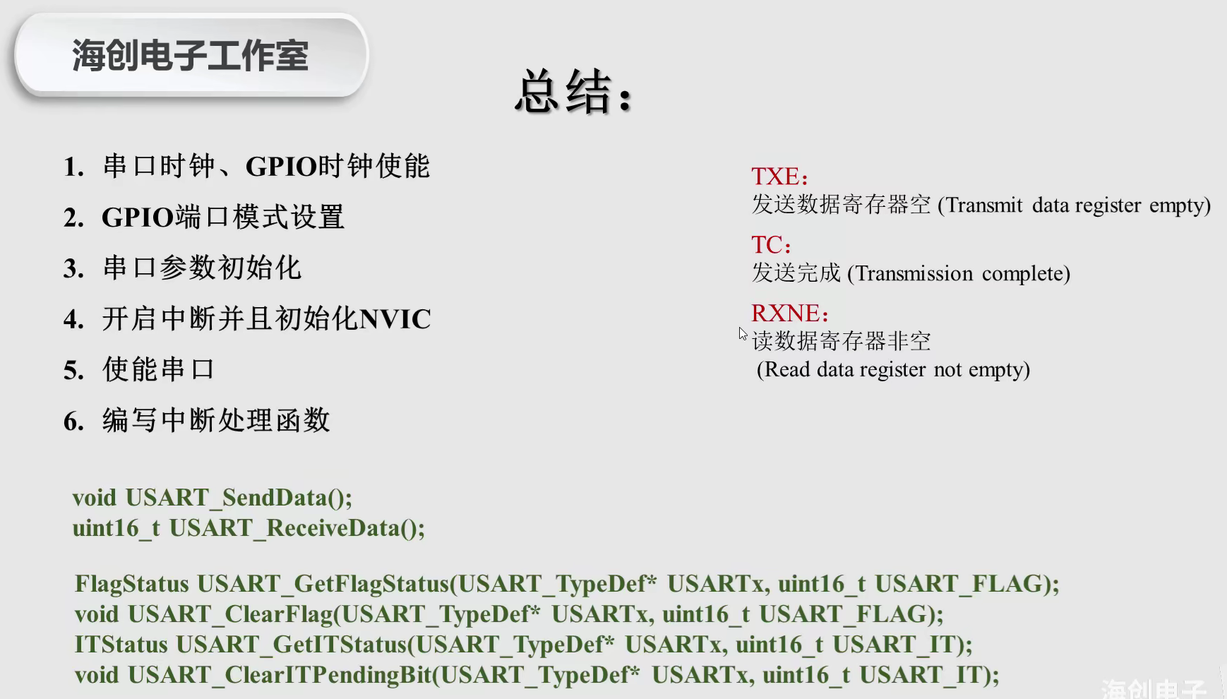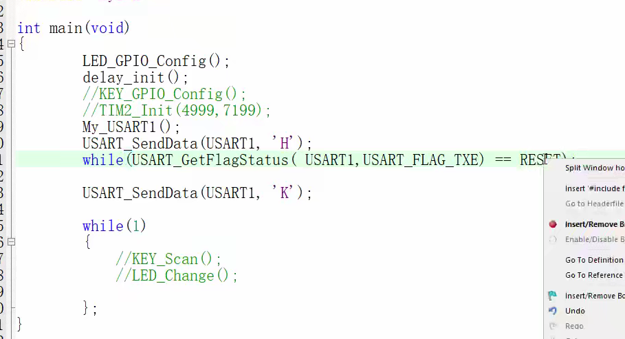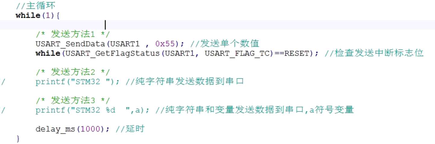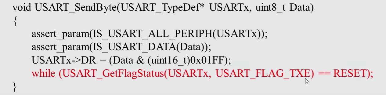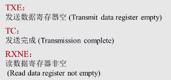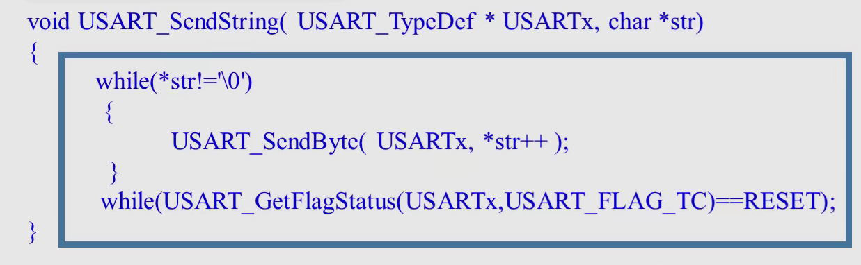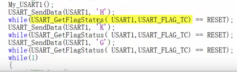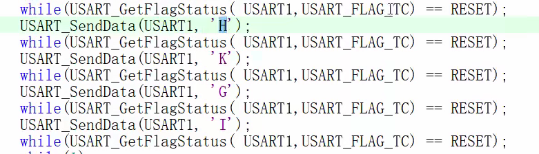依次发送字符串中的字符,每发送一次检查一下 TXE位,到最后的字符发完后,他就会跳出中间的while循环来到最后一个 判断TC位