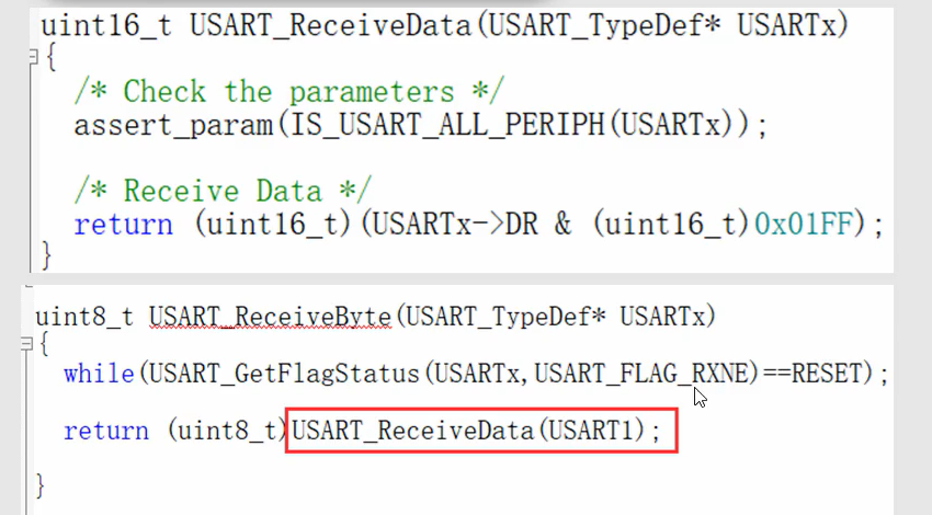在上面这两个函数中,第一个是我们库函数里面所带有的,但是我们对他进行一点修改,进行标志位的一个判断,所以我们有了一个新的函数ReceiveByte,用我们的ReceiveData作为我们的返回值