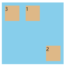 <head><style>.box {display: flex;width: 200px;height: 200px;background-color: skyblue;}.box div {width: 50px;height: 50px;margin: 10px;background-color: burlywood;}.box div:nth-child(2){align-self: flex-end;}.box div:nth-child(3) {order: -1;}</style>