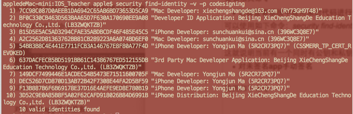 每个证书(其实是公钥)都对应有一个私钥,私钥会被用来对代码、资源文件等签名。只有开发证书和描述文件是没办法正常调试的,因为没有私钥根本无法签名。签名相关命令
