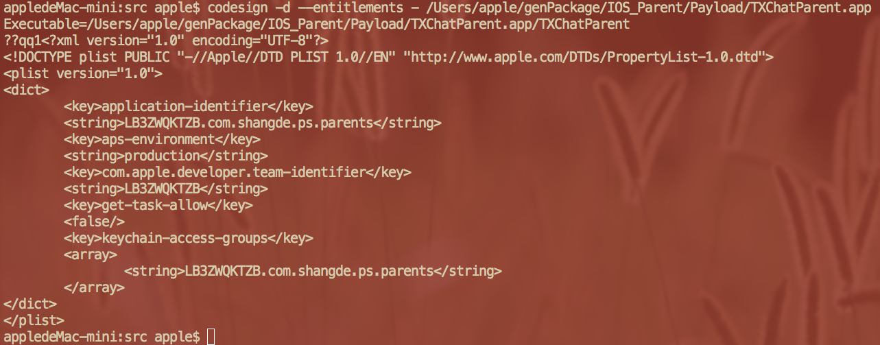 在 iOS 上你的应用能做什么依然是沙盒限制的,这些限制大多情况下都由授权文件(entitlements)来决定。授权机制决定了哪些系统资源在什么情况下允许被一个应用使用,简单的说它就是一个沙盒的配置列表。运行如下命令:codesign -d --entitlements - /Users/apple/genPackage/IOS_Parent/Payload/TXChatParent.app