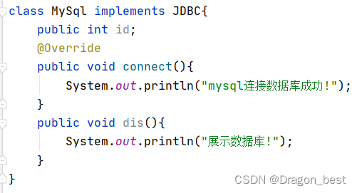 原因:jdbc1的编译时类型为JDBC,JDBC接口中没有声明dis方法,故根据"编译看左边,运行看右边"的思路,jdbc1显然没有dis方法;假若将c.newInstance强转为MySql类型是否可以调用dis方法呢?