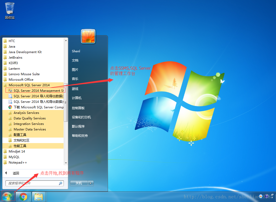 1 首先打开SSMS,在”开始”→”所有程序”找到” Microsoft SQL Server 2014”然后点击” SQL Server 2014 Management Studio”