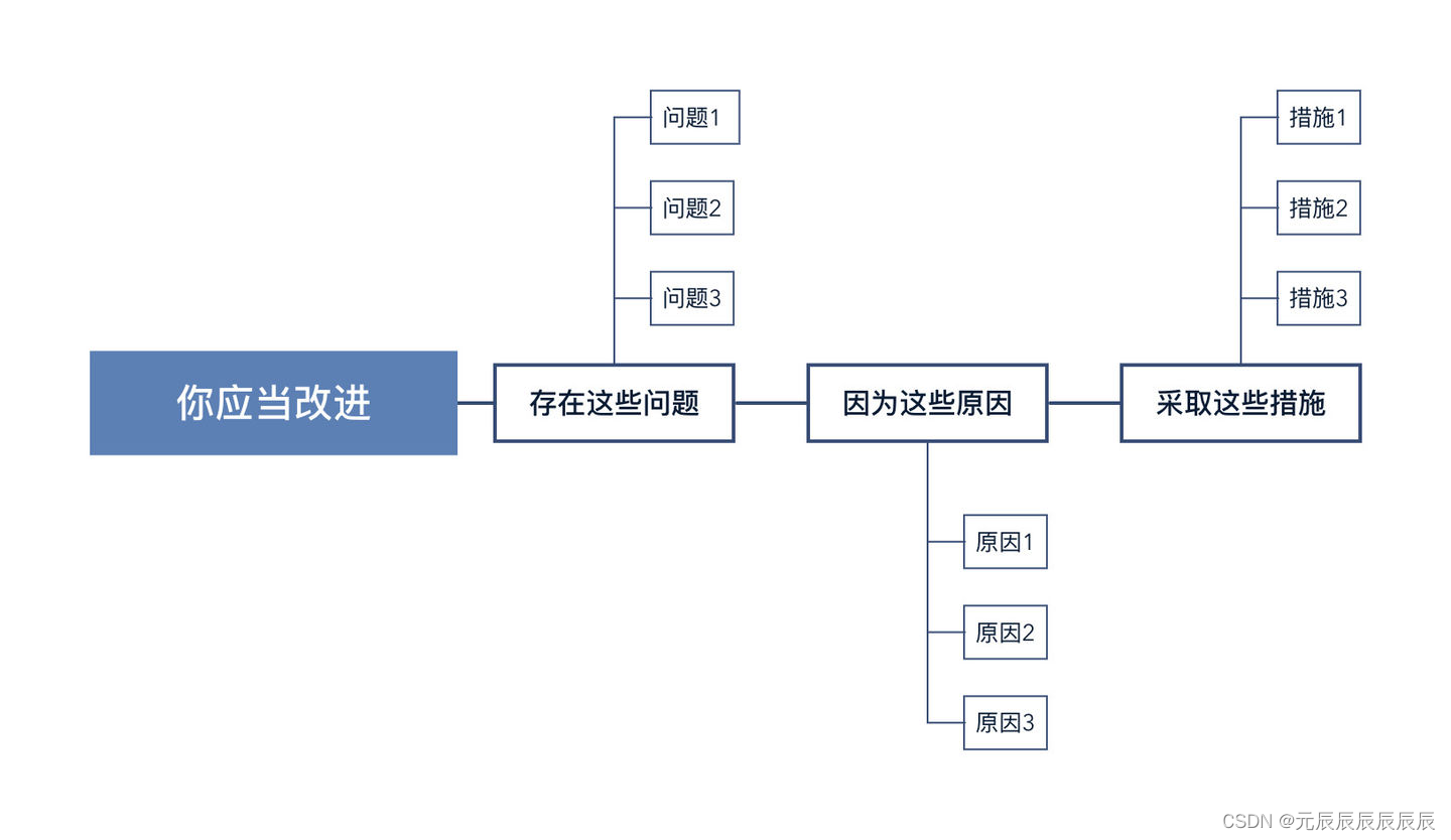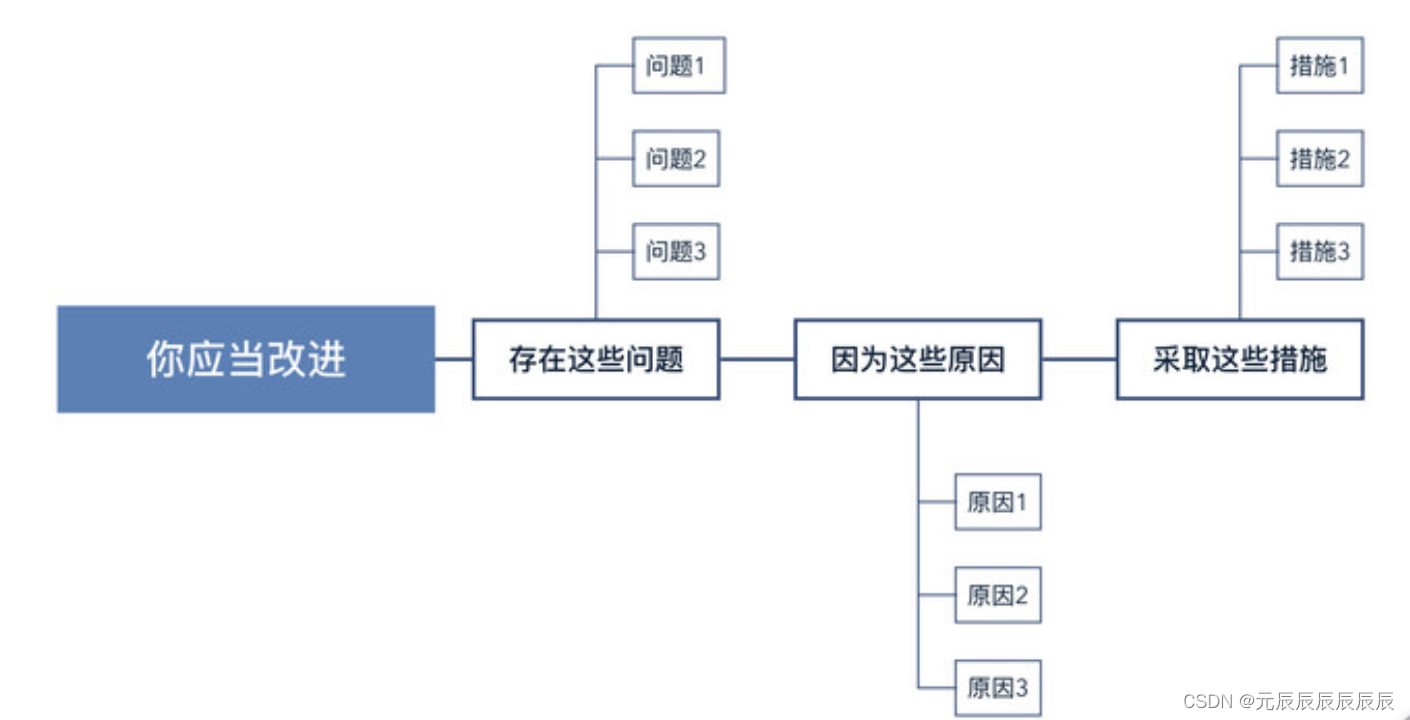 自上而下表达,结论先行:当我们先提出总的概念,再列出具体项目,即自上而下地呈现思想时,可以最有效的进行沟通和写作表达,类似于从收敛到发散的过程,脑图结构;