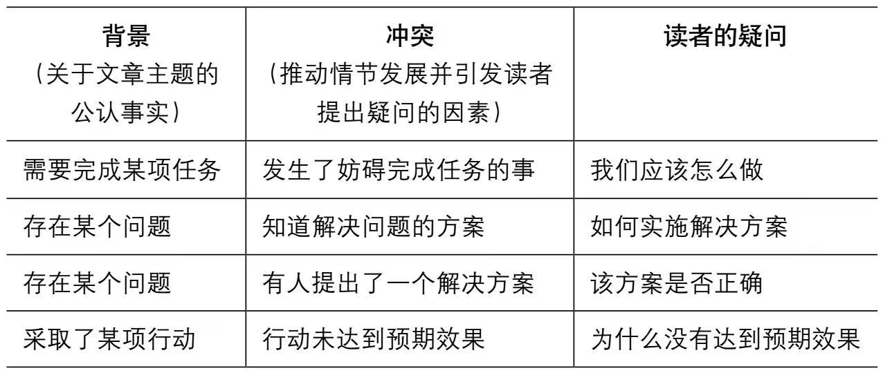 在进行观点阐述时将背景、冲突、疑问等进行说明与解答可以更好地吸引读者注意力。