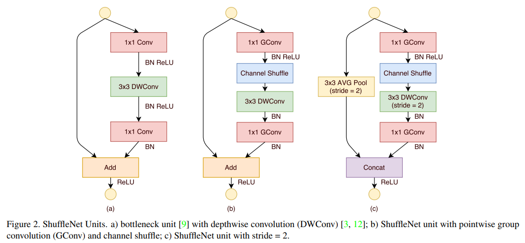 图(b)即ShuffleNet unit,将第一个1×1卷积替换为逐点组卷积,再作通道混洗,主分支最后的1×1Conv改为1×1GConv,为了适配和恒等映射做通道融合。配合BN层和ReLU激活函数构成基本单元。