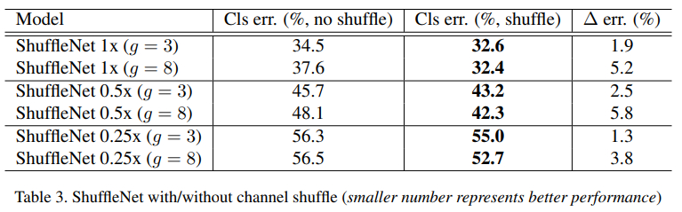 表2还显示,对于一些模型,随着g增大,性能上有所下降。意味组数增加,每个卷积滤波器的输入通道越来越少,损害了模型表示能力。