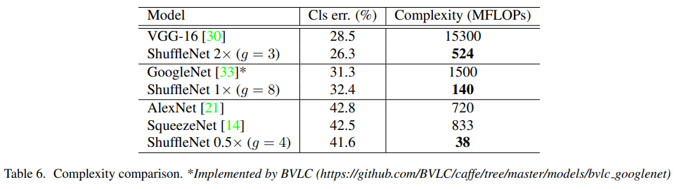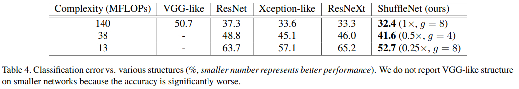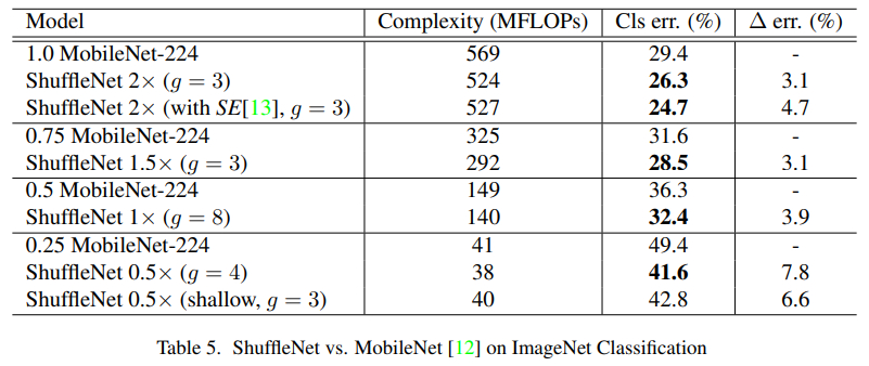相比于不同深度的模型对比,可以看到我们的模型要比MobileNet的效果要好,这表明ShuffleNet的有效性主要来源于高效的结构设计,而不是深度。