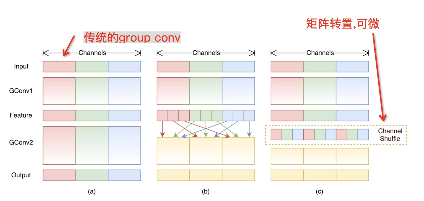如果我们允许组卷积能够得到不同组的输入数据,即上图(b)所示效果,那么输入和输出通道会是全关联的。具体来说,对于上一层输出的通道,我们可做一个混洗(Shuffle)操作,如上图©所示,再分成几个组,feed到下一层。