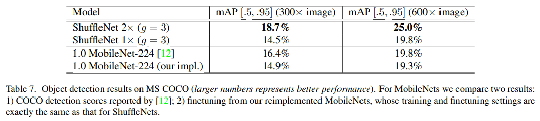 我们在MS COCO目标检测任务上测试ShuffleNet的泛化和迁移学习能力,以Faster RCNN为例: