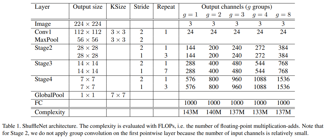 在上面的基本单元基础上,我们提出了ShuffleNet的整体架构: