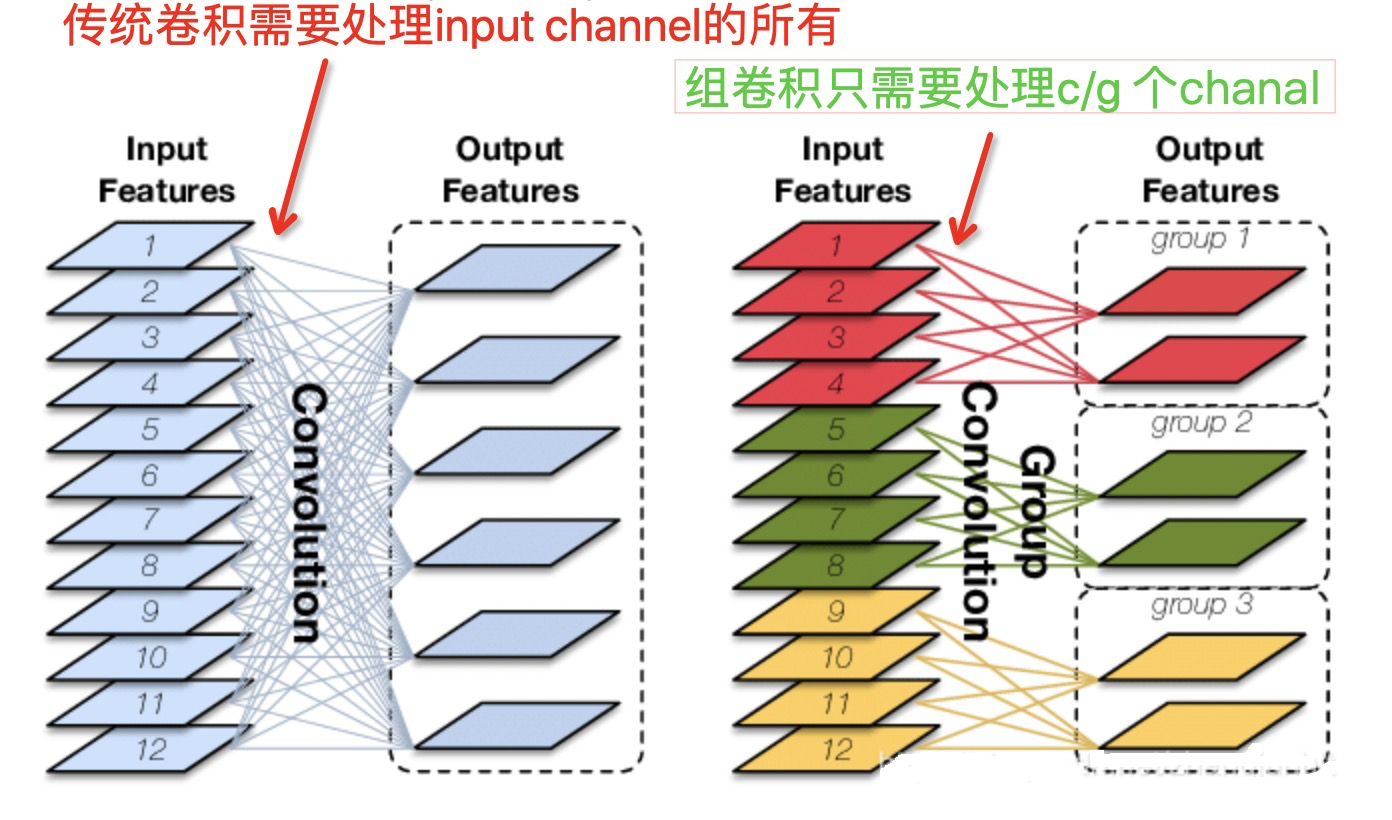 组卷积(Group Convolutions):为了解决这个问题,一个直接的方法是应用通道稀疏连接,例如组卷积(group convolutions)。通过确保每个卷积操作仅在对应的输入通道组上,组卷积可以显著的降低计算损失。然而,如果多个组卷积堆叠在一起,会有一个副作用: 某个通道输出仅从一小部分输入通道中导出,如下图(a)所示,这样的属性降低了通道组之间的信息流通,降低了信息表示能力。