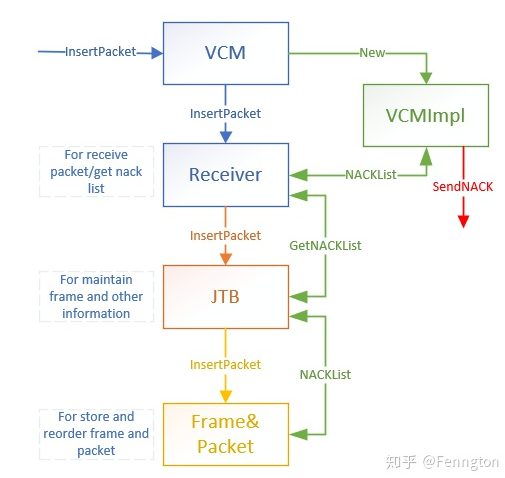 3) vi_channel 开启线程,jitterbuffer对数据包进行处理、数据帧获取、数据包插入,数据包重排等操作;jitterbuffer进行插包处理,同时进行NACKList构建;