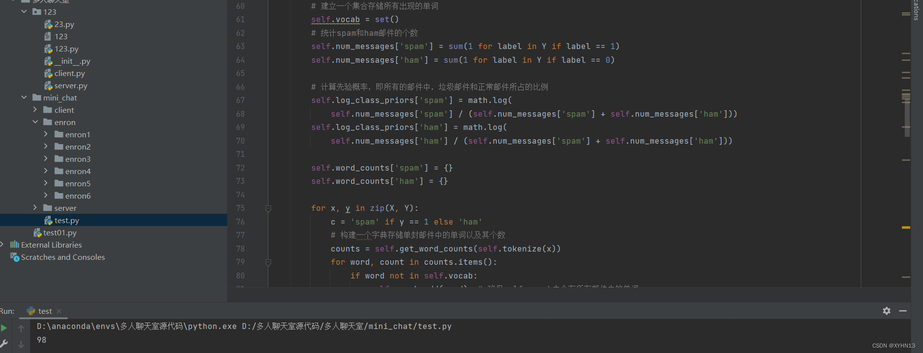实验代码: import os import re import string import mathDATA_DIR = 'enron' target_names = ['ham', 'spam']def get_data(DATA_DIR):subfolders = ['enron%d' % i for i in range(1, 7)]data = []target = []for subfolder in subfolders:# spamspam_files = os.listdir(os.path.join(DATA_DIR, subfolder, 'spam'))for spam_file in spam_files:with open(os.path.join(DATA_DIR, subfolder, 'spam', spam_file), encoding="latin-1") as f:data.append(f.read())target.append(1)# hamham_files = os.listdir(os.path.join(DATA_DIR, subfolder, 'ham'))for ham_file in ham_files:with open(os.path.join(DATA_DIR, subfolder, 'ham', ham_file), encoding="latin-1") as f:data.append(f.read())target.append(0)return data, targetX, y = get_data(DATA_DIR)class SpamDetector_1(object):"""Implementation of Naive Bayes for binary classification"""# 清除空格def clean(self, s):translator = str.maketrans("", "", string.punctuation)return s.translate(translator)# 分开每个单词def tokenize(self, text):text = self.clean(text).lower()return re.split("\W+", text)# 计算某个单词出现的次数def get_word_counts(self, words):word_counts = {}for word in words:word_counts[word] = word_counts.get(word, 0.0) + 1.0return word_countsclass SpamDetector_2(SpamDetector_1):# X:data,Y:target标签(垃圾邮件或正常邮件)def fit(self, X, Y):self.num_messages = {}self.log_class_priors = {}self.word_counts = {}# 建立一个集合存储所有出现的单词self.vocab = set()# 统计spam和ham邮件的个数self.num_messages['spam'] = sum(1 for label in Y if label == 1)self.num_messages['ham'] = sum(1 for label in Y if label == 0)# 计算先验概率,即所有的邮件中,垃圾邮件和正常邮件所占的比例self.log_class_priors['spam'] = math.log(self.num_messages['spam'] / (self.num_messages['spam'] + self.num_messages['ham']))self.log_class_priors['ham'] = math.log(self.num_messages['ham'] / (self.num_messages['spam'] + self.num_messages['ham']))self.word_counts['spam'] = {}self.word_counts['ham'] = {}for x, y in zip(X, Y):c = 'spam' if y == 1 else 'ham'# 构建一个字典存储单封邮件中的单词以及其个数counts = self.get_word_counts(self.tokenize(x))for word, count in counts.items():if word not in self.vocab:self.vocab.add(word) # 确保self.vocab中含有所有邮件中的单词# 下面语句是为了计算垃圾邮件和非垃圾邮件的词频,即给定词在垃圾邮件和非垃圾邮件中出现的次数。# c是0或1,垃圾邮件的标签if word not in self.word_counts[c]:self.word_counts[c][word] = 0.0self.word_counts[c][word] += countMNB = SpamDetector_2() MNB.fit(X[100:], y[100:])class SpamDetector(SpamDetector_2):def predict(self, X):result = []flag_1 = 0# 遍历所有的测试集for x in X:counts = self.get_word_counts(self.tokenize(x)) # 生成可以记录单词以及该单词出现的次数的字典spam_score = 0ham_score = 0flag_2 = 0for word, _ in counts.items():if word not in self.vocab:continue# 下面计算P(内容|垃圾邮件)和P(内容|正常邮件),所有的单词都要进行拉普拉斯平滑else:# 该单词存在于正常邮件的训练集和垃圾邮件的训练集当中if word in self.word_counts['spam'].keys() and word in self.word_counts['ham'].keys():log_w_given_spam = math.log((self.word_counts['spam'][word] + 1) / (sum(self.word_counts['spam'].values()) + len(self.vocab)))log_w_given_ham = math.log((self.word_counts['ham'][word] + 1) / (sum(self.word_counts['ham'].values()) + len(self.vocab)))# 该单词存在于垃圾邮件的训练集当中,但不存在于正常邮件的训练集当中if word in self.word_counts['spam'].keys() and word not in self.word_counts['ham'].keys():log_w_given_spam = math.log((self.word_counts['spam'][word] + 1) / (sum(self.word_counts['spam'].values()) + len(self.vocab)))log_w_given_ham = math.log(1 / (sum(self.word_counts['ham'].values()) + len(self.vocab)))# 该单词存在于正常邮件的训练集当中,但不存在于垃圾邮件的训练集当中if word not in self.word_counts['spam'].keys() and word in self.word_counts['ham'].keys():log_w_given_spam = math.log(1 / (sum(self.word_counts['spam'].values()) + len(self.vocab)))log_w_given_ham = math.log((self.word_counts['ham'][word] + 1) / (sum(self.word_counts['ham'].values()) + len(self.vocab)))# 把计算到的P(内容|垃圾邮件)和P(内容|正常邮件)加起来spam_score += log_w_given_spamham_score += log_w_given_hamflag_2 += 1# 最后,还要把先验加上去,即P(垃圾邮件)和P(正常邮件)spam_score += self.log_class_priors['spam']ham_score += self.log_class_priors['ham']# 最后进行预测,如果spam_score > ham_score则标志为1,即垃圾邮件if spam_score > ham_score:result.append(1)else:result.append(0)flag_1 += 1return resultMNB = SpamDetector() MNB.fit(X[100:], y[100:]) pred = MNB.predict(X[:100]) true = y[:100]accuracy = 0 for i in range(100):if pred[i] == true[i]:accuracy += 1 print(accuracy) # 0.98