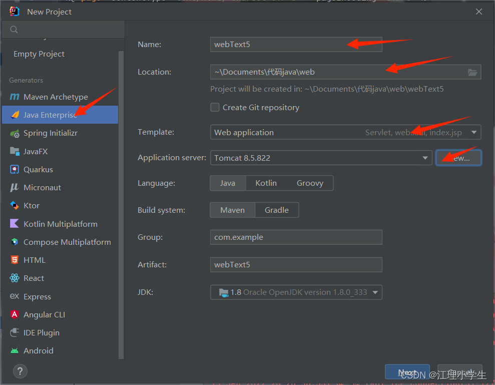 idea版本2022 1.2 //记录一下javaweb的创建 name项目名称 location存储地址 Application server:选择new 选中Tomact service 点击下一步 点击下一步就创建成功了