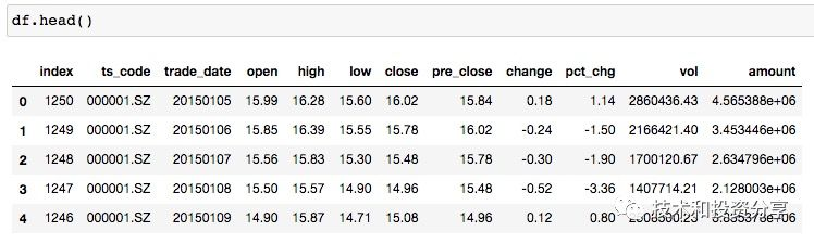 df = pro.daily(ts_code=‘000001.SZ’, start_date=‘2015-01-01’, end_date=‘2020-02-25’)df.head() #用 df.head() 可以查看一下下载下来的股票价格数据,显示数据如下: