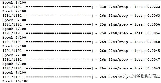 regressor.add(Dropout(0.2))regressor.add(Dense(units = 1))regressor.compile(optimizer = 'adam', loss = 'mean_squared_error')regressor.fit(X_train, y_train, epochs = 100, batch_size = 32)