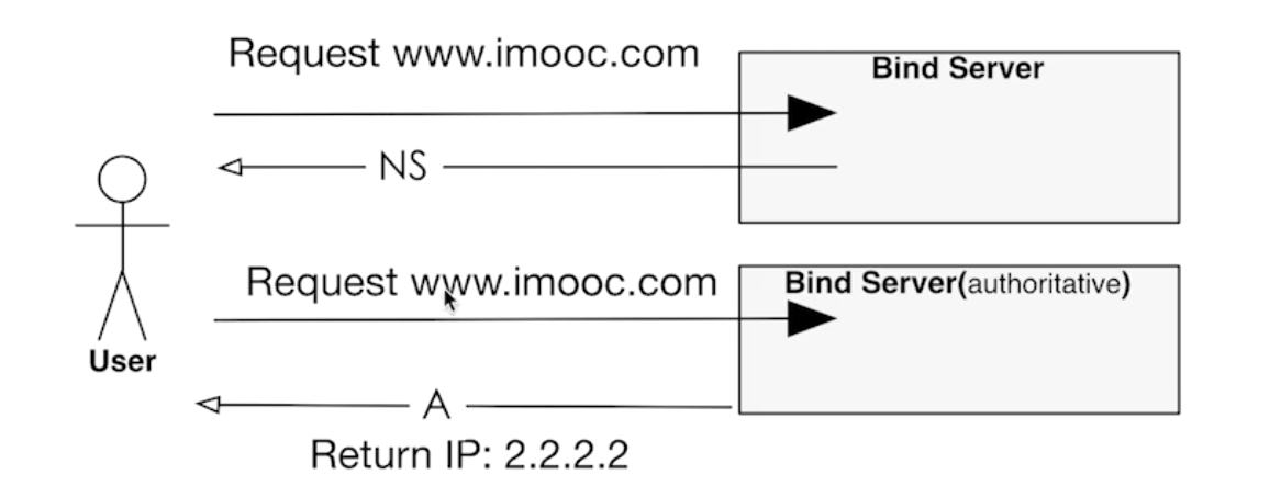 用户发送请求给bind服务,bind服务不能提供权威的解析,NS返回给用户,用户再发送请求给权威bind的服务器,最后返回IP给用户