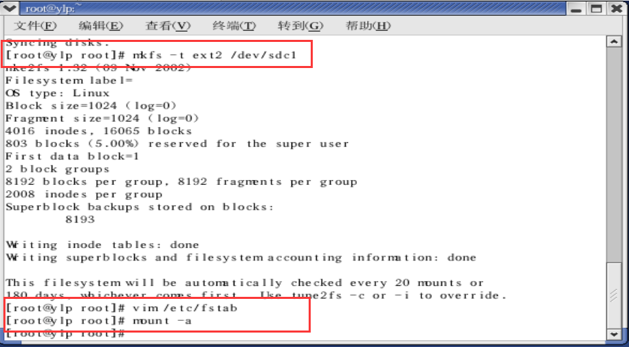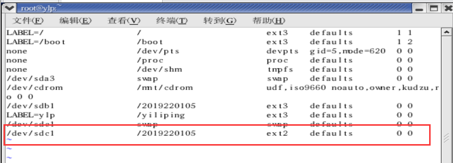 vim /etc/fstab /dev/sdc1 /2019220105 ext2 defaults 0 0