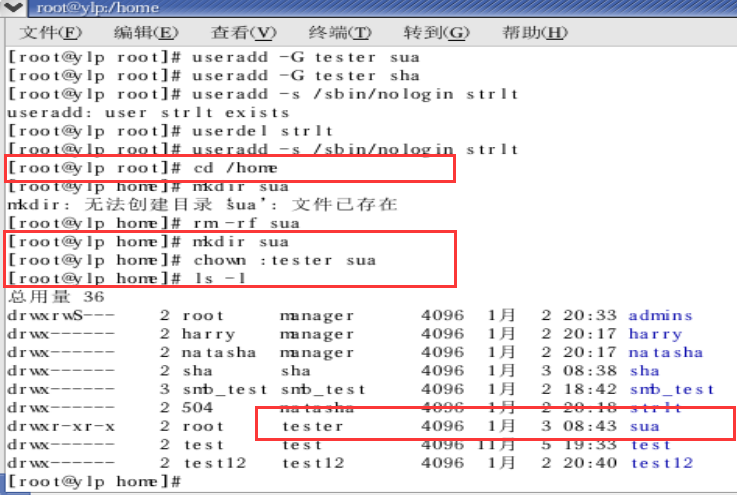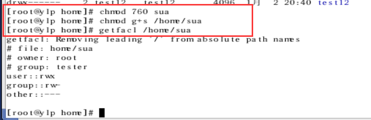 3、在/home下创建一个目录,名为sua,要求所属组为tester组,组成员可以读写,其他用户没有任何权限,同组成员在目录下创建的文件的所属组也为tester组。