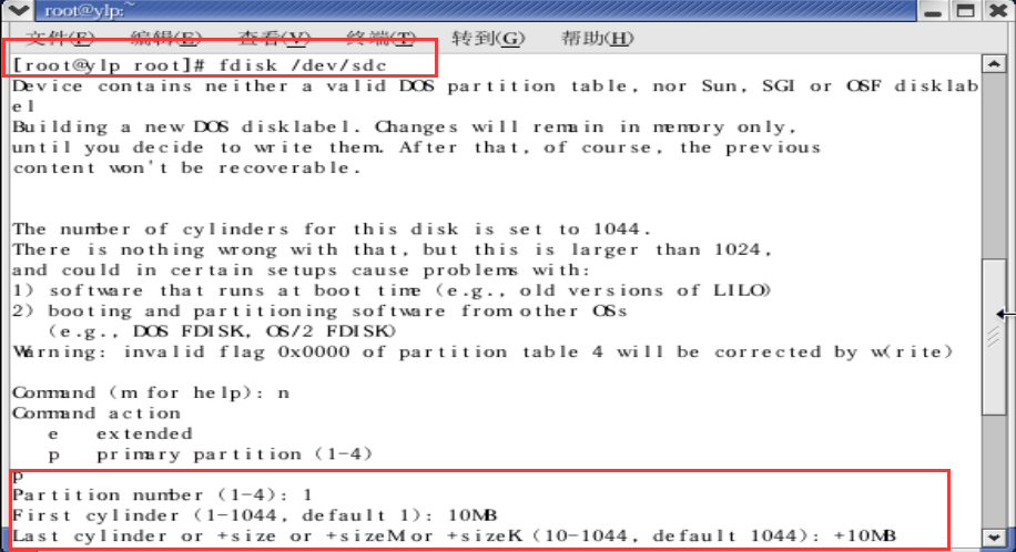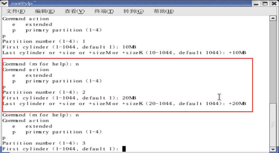 n新建分区,p 表示是主分区, w 保存磁盘分区,1--从10开始---大小为+10MB, 2--20MB---+20MB