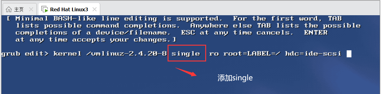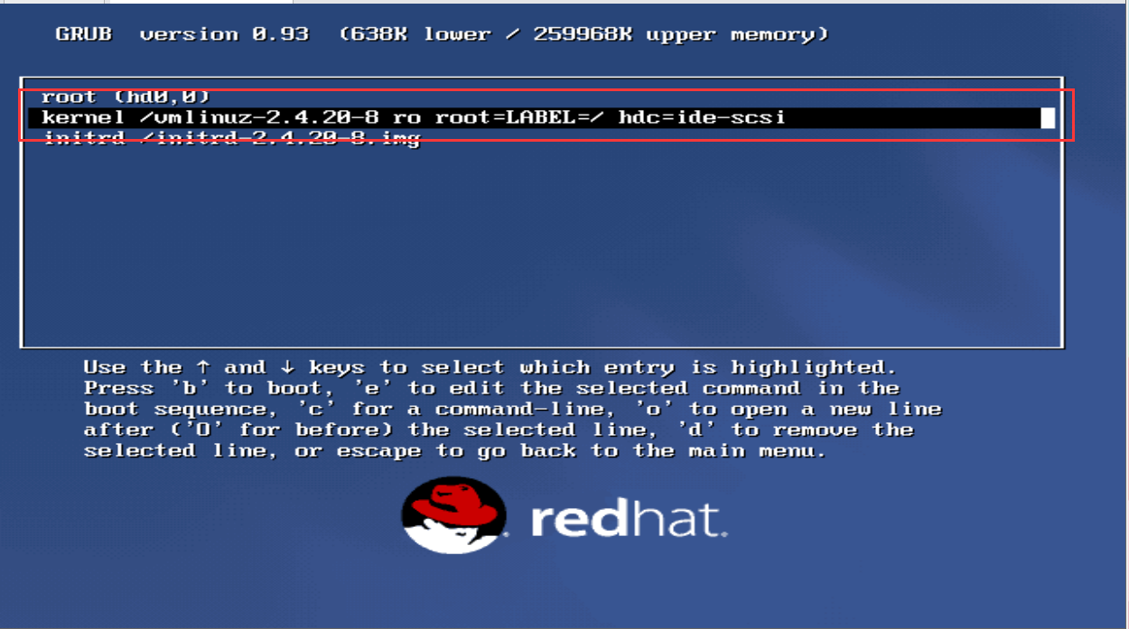 用上下键选中第二项(类似于kernel /boot/vmlinuz-2.4.18-14 ro root=LABEL=/)