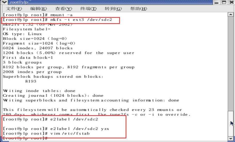 e2label /dev/sdc2 yzx --新建卷标 名称为yzx