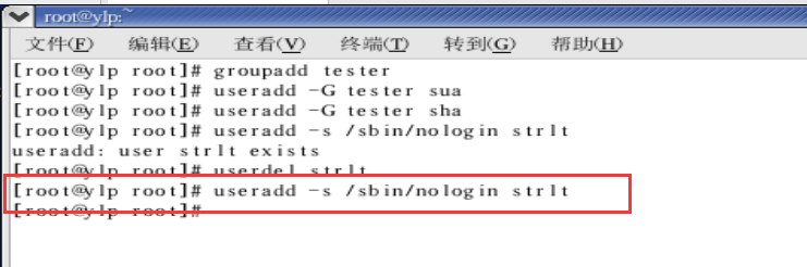 2、建立tester组,创建两个用户sua,sha,他们的附属组都为tester,创建用户strlt,用户strlt的登录shell为非交互式shell。