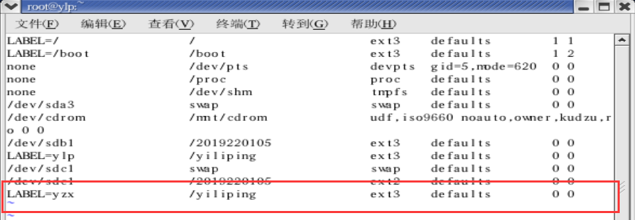 vim /etc/fstab LABEL=yzx /yiliping ext3 defaults 0 0