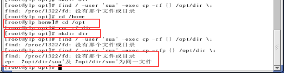拷贝:find / -user ‘sua’ -exec cp -rfp {} /opt/dir \ ;