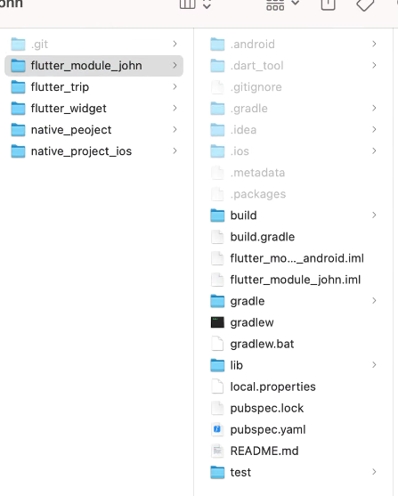 上面就是 flutter_module_john 模块中的文件结构; 你会发现它里面包含 .android 与 .ios,这两个文件夹是 隐藏文件夹(mac 中你必须打开隐藏开关 才能看到文件夹),也是 flutter_module_john 宿主工程: