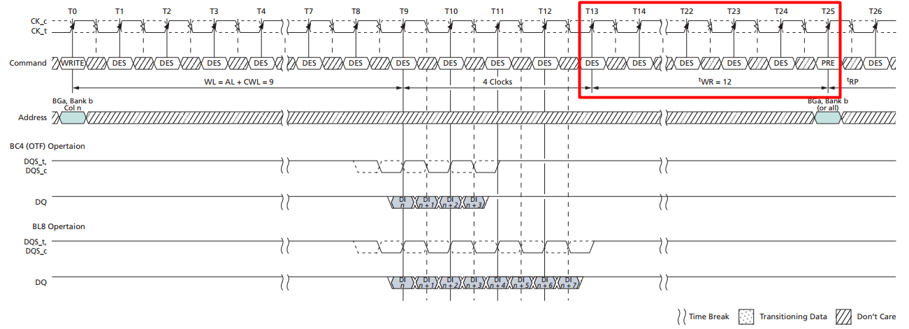 - 较低的tWR可以提高系统性能,但可能导致数据还未完全正确写入内存单元,就发生了预充电操作,导致数据的丢失和损坏。
