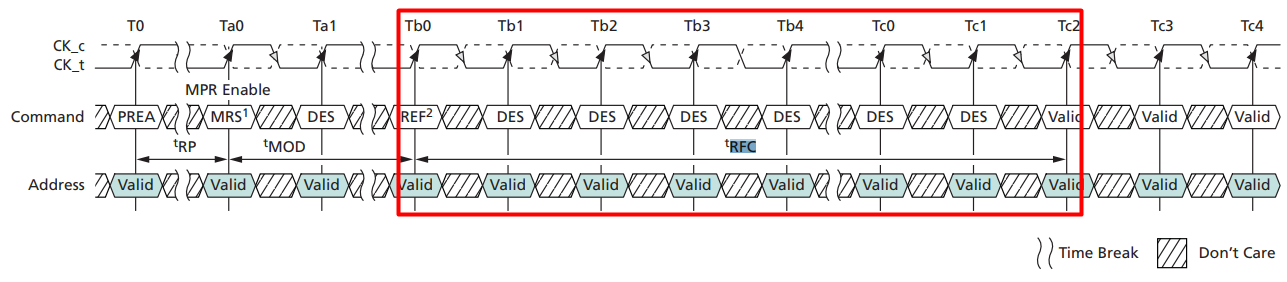tRFC(Row Refresh Cycle Time):SDRAM行刷新周期时间,它是行单元刷新所需要的时钟周期数或者是纳秒(ns)。定义了一个bank中行地址刷新所需要的时间,容量大的bank行地址和cell单元会更多,刷新时间更长,因此tRFC也要更高。