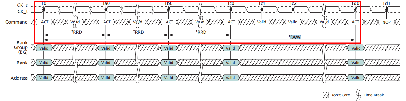 tFAW(Four Active Window):它定义了一个rank中允许同时发送大于4个bank行激活的命令的间隔时间