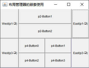 运行结果如下,可自行对比代码与结果理解JPanel。其中,容器的GridLayout布局设置了横纵都为10的间距,JPanel的GridLayout布局没有设置网格间距。
