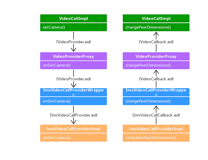 界面通过IVideoProvider控制camera的显示并设置TextureView等,Ims service通过IVideoCallback来通知一些media的更新。如下