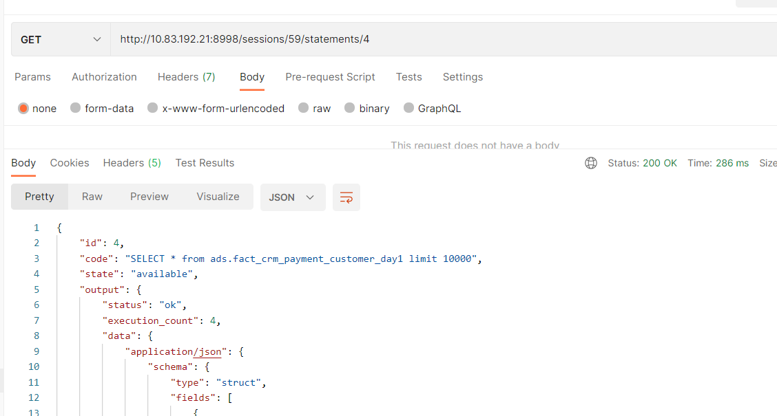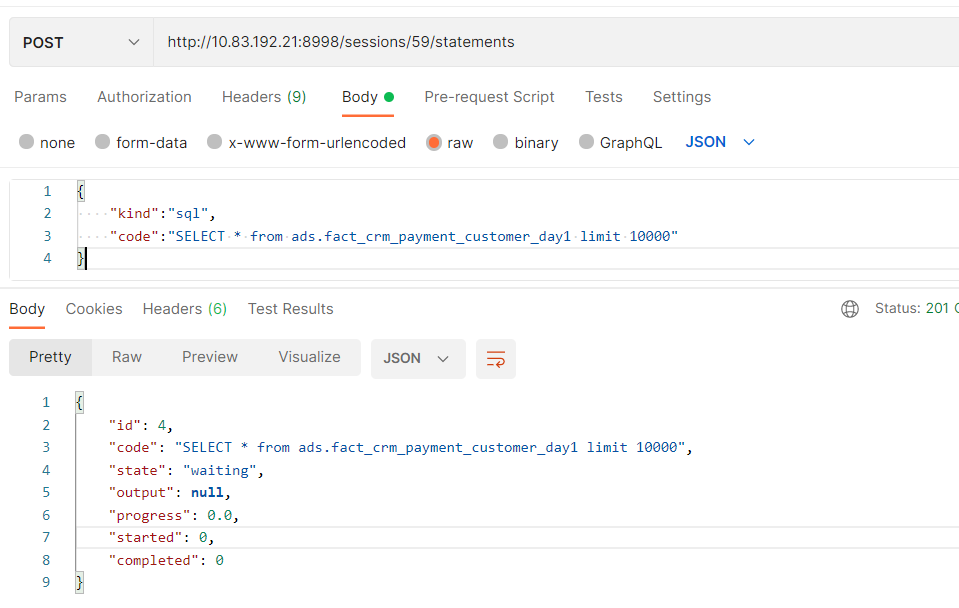 public class LivyClient {protected String url;public static final int CREATE_SESSION_TIMEOUT = 10 * 60;public static String NAME_PREFIX = "bdp@";private OkHttpClient okHttpClient;public LivyClient(String livyUrl) {this.url = livyUrl;this.okHttpClient = new OkHttpClient.Builder().connectTimeout(50000, TimeUnit.MILLISECONDS).readTimeout(50000, TimeUnit.MILLISECONDS).build();}//create sessionpublic LivySession createSession(BdpLivyInfo bdpLivyInfo) throws IOException {JSONObject body = new JSONObject();body.put("proxyUser", bdpLivyInfo.getProxyUser());body.put("kind", "sql");body.put("driverMemory", bdpLivyInfo.getDriverMemory());body.put("driverCores", bdpLivyInfo.getDriverCores());body.put("executorMemory", bdpLivyInfo.getExecutorMemory());body.put("executorCores", bdpLivyInfo.getExecutorCores());body.put("numExecutors", bdpLivyInfo.getNumExecutors());body.put("queue", bdpLivyInfo.getQueue());body.put("heartbeatTimeoutInSecond",bdpLivyInfo.getHeartbeatTimeoutInSecond());body.put("name", NAME_PREFIX + GuidUtils.newGuild());JSONObject sparkConf = new JSONObject();sparkConf.put("spark.dynamicAllocation.enabled", true);sparkConf.put("spark.shuffle.service.enabled", true);body.put("conf", sparkConf);RequestBody requestBody = RequestBody.create(MediaType.parse("application/json; charset=utf-8"), body.toString());Request request = new Request.Builder().url(url + "/sessions").post(requestBody).header("X-Requested-By", "DataQuery").build();Response response = okHttpClient.newCall(request).execute();String responseContent = response.body().string();int code = response.code();if (!(code >= 200 && code < 300)) {throw new IOException("create session exception: " + responseContent);}LivySession session = JSONObject.parseObject(responseContent, LivySession.class);session.setLivyClient(this);session.setBdpLivyInfo(bdpLivyInfo);//轮询等待Stopwatch sw = Stopwatch.createStarted();for (; ; ) {try {Thread.sleep(2000);log.info("waiting some time for creating session:{}", session.getId());//超时处理long elapsed = sw.elapsed(TimeUnit.SECONDS);if (elapsed > CREATE_SESSION_TIMEOUT) {log.error("create session timeout(s) : " + CREATE_SESSION_TIMEOUT);deleteSession(session.getId());throw new IOException("create session timeout");}LivySession session_current = getSession(session.getId());session_current.setLivyClient(this);session_current.setBdpLivyInfo(bdpLivyInfo);if (StringUtils.equals(session_current.getState(), LivySessionState.idle.name())) {return session_current;} else if (StringUtils.equals(session_current.getState(), LivySessionState.starting.name())) {continue;} else {deleteSession(session.getId());log.error("create session error,state:{}", session_current.getState());}} catch (Exception e) {log.error("create session error:{}", e.getMessage());throw new IOException("create session error : " + e.getMessage());}}}//delete sessionpublic void deleteSession(String sessionId) throws IOException {Request request = new Request.Builder().url(url + "/sessions/" + sessionId).delete().header("X-Requested-By", "DataQuery").build();Response response = okHttpClient.newCall(request).execute();String responseContent = response.body().string();int code = response.code();if (!(code >= 200 && code < 300)) {throw new IOException("delete session exception: " + responseContent);}}//get sessionpublic LivySession getSession(String sessionId) throws IOException {Request request = new Request.Builder().url(url + "/sessions/" + sessionId).get().header("X-Requested-By", "DataQuery").build();Response response = okHttpClient.newCall(request).execute();String responseContent = response.body().string();int code = response.code();if (code == 404) {return null;}if (!(code >= 200 && code < 300)) {throw new IOException("get session exception: " + responseContent);}LivySession session = JSONObject.parseObject(responseContent, LivySession.class);return session;}//list sessionpublic LivySessionListResponse listSession() throws IOException {Request request = new Request.Builder().url(url + "/sessions/").get().header("X-Requested-By", "DataQuery").build();Response response = okHttpClient.newCall(request).execute();String responseContent = response.body().string();int code = response.code();if (!(code >= 200 && code < 300)) {throw new IOException("list session exception: " + responseContent);}LivySessionListResponse listSessionResponse = JSONObject.parseObject(responseContent, LivySessionListResponse.class);return listSessionResponse;}//execute statementpublic LivyStatement executeStatement(String sessionId, String code_, String kind) throws IOException {JSONObject body = new JSONObject();body.put("code", code_);body.put("kind", kind);RequestBody requestBody = RequestBody.create(MediaType.parse("application/json; charset=utf-8"), body.toString());Request request = new Request.Builder().url(url + "/sessions/" + sessionId + "/statements").post(requestBody).header("X-Requested-By", "DataQuery").build();Response response = okHttpClient.newCall(request).execute();String responseContent = response.body().string();int code = response.code();if (!(code >= 200 && code < 300)) {throw new IOException("execute statement exception: " + responseContent);}LivyStatement statement = JSONObject.parseObject(responseContent, LivyStatement.class);return statement;}//get statementpublic LivyStatement getStatement(String sessionId, String statementId) throws IOException {Request request = new Request.Builder().url(url + "/sessions/" + sessionId + "/statements/" + statementId).get().header("X-Requested-By", "DataQuery").build();Response response = okHttpClient.newCall(request).execute();String responseContent = response.body().string();int code = response.code();if (!(code >= 200 && code < 300)) {log.info("------response------------"+response.toString());throw new IOException("get statement exception: " + responseContent);}LivyStatement statement = JSONObject.parseObject(responseContent, LivyStatement.class);return statement;}//cancel statementpublic void cancelSta