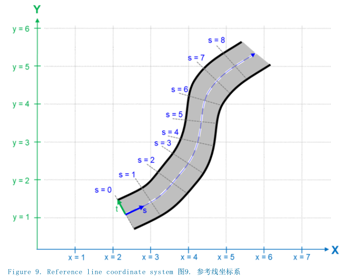 s :坐标沿参考线,以[m]为单位,由道路参考线的起点开始测量,在xy平面中计算(也就是说,这里不考虑道路的高程剖面);