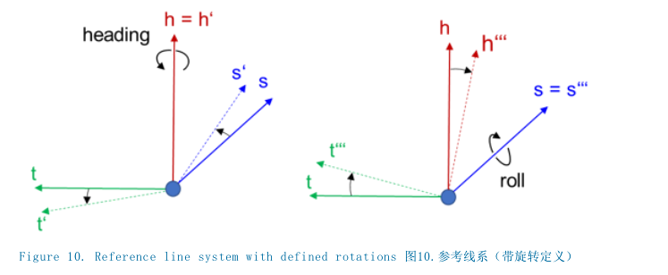 与惯性系相似,s’/t’/h’ 与s’’’/t’’’/h’’’指的是围绕航向角/偏航角和横摆角/翻滚角旋转后得到的坐标系。如图11所示,通过提供原点坐标以及相对于惯性坐标系原点的方向(航向角/偏航角),参考线坐标系可(can)被置于惯性空间中。