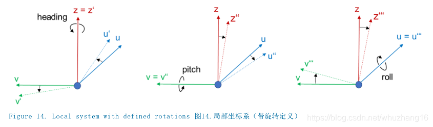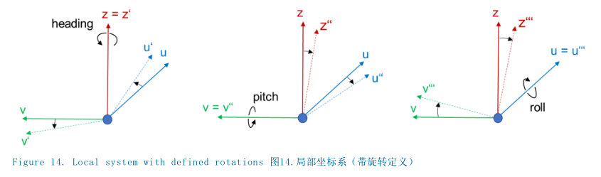 可通过依次设置航向角/偏航角、俯仰角和横摆角/翻滚角,将元素(例如物体)置于局部坐标系中: