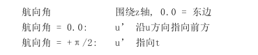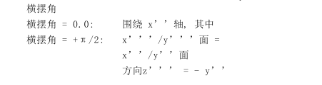 x’/y’/(z’=z) 指的是以航向角/偏航角围绕z轴旋转x/y/z轴之后的坐标系。坐标系x’’/(y’’=y’)/z’’指的是以俯仰角围绕y’轴旋转x’/y’/z’轴之后的坐标系。最后,坐标系(x’’’=x’’)/y’’’/z’’’在用横摆角/翻滚角旋转x’’/y’’/z’’后获得。