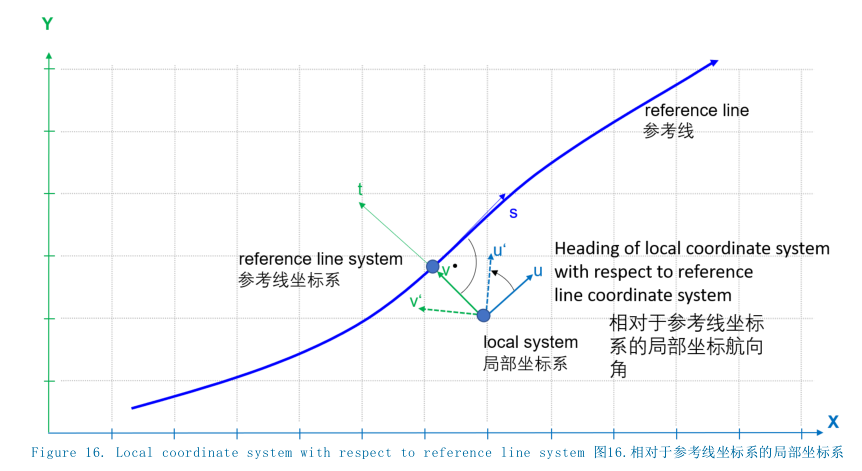 图14展示了对应角的正轴与正方向。局部坐标系只能(can)通过以下方法被置于参考线空间中:如图16所示,在参考线坐标系中提供局部坐标系的原点和相对于参考线坐标系、局部系原点的方向(航向角/偏航角)。