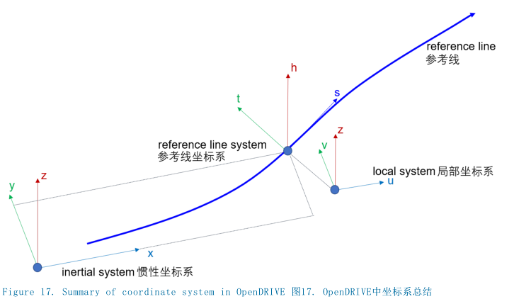 惯性坐标系、参考线坐标系和局部坐标系将在OpenDRIVE中同时被使用。图17中的示例描述了三个坐标系相对于彼此的位置与方向设定。