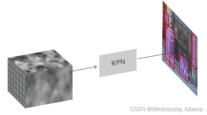 先形象解释一下:左侧是特征图 ,立方体厚度决定于特征图维度。右侧红框就是经过该网络后提取出的感兴趣ROI区域。 这个特征图生成方法很多了,例如 ZF,VGG ,Resnet 什么的都可以。这里就不细说了。RPN不关注具体目标是啥,是车,是人或者狗,楼房都可以。它只是将框内认为是目标,框外认为是背景,做了个二分类。至于框内目标具体是啥,最终是交给分类网络去做。结果会略显潦草,后面会对边框进行提炼。
